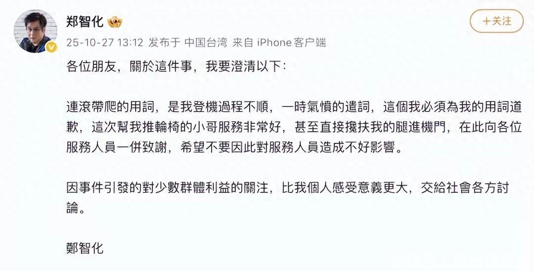 郑智化从被全网心疼的对象,到被舆论追问真相,这个过程恰恰证明了,现在的人越来越不吃“卖惨”这一套了。他非常成功的把一个涉及到公众事件的这种问题,造成对立的这个问题。你看巧妙的他把它降维成了:情绪上头,用词不当的这种小瑕疵。现在呢他发文说他错了。他道歉了,但又没完全道歉——他只为“用词”道歉,却回避了最初描述是否严重失实这个核心问题。